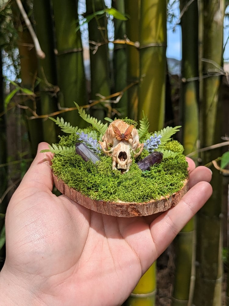 Tea stained mink skull on a moss covered plaque, has amethyst crystals!